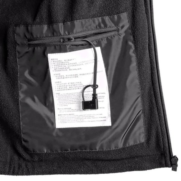 2 poches latérales zippées. 1 poche intérieure zippée avec câble USB-A. Col montant avec protège-menton. Bouton marche/arrêt côté coeur. Emmanchures élastiquées. Fermeture full zip. Coupe droite. 280 gr /m². Doublure micropolaire 100% polyester.